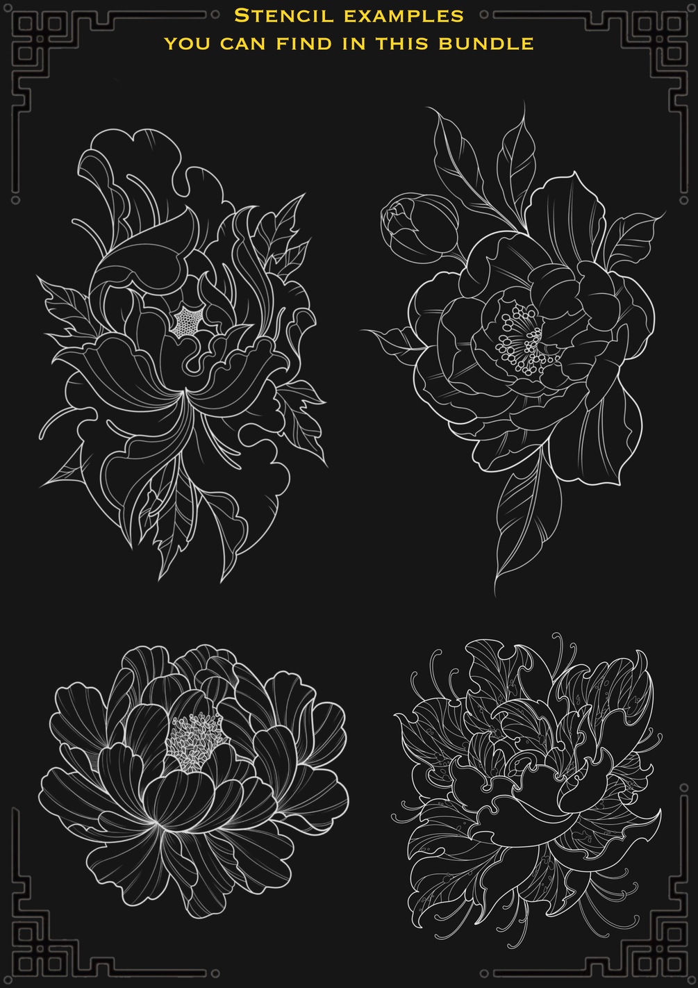 New release 20 Peony tattoo stencil bundle created for your projects. These are perfect for tattoos, but they can be used to coloring or others projects and also boost your creativity.